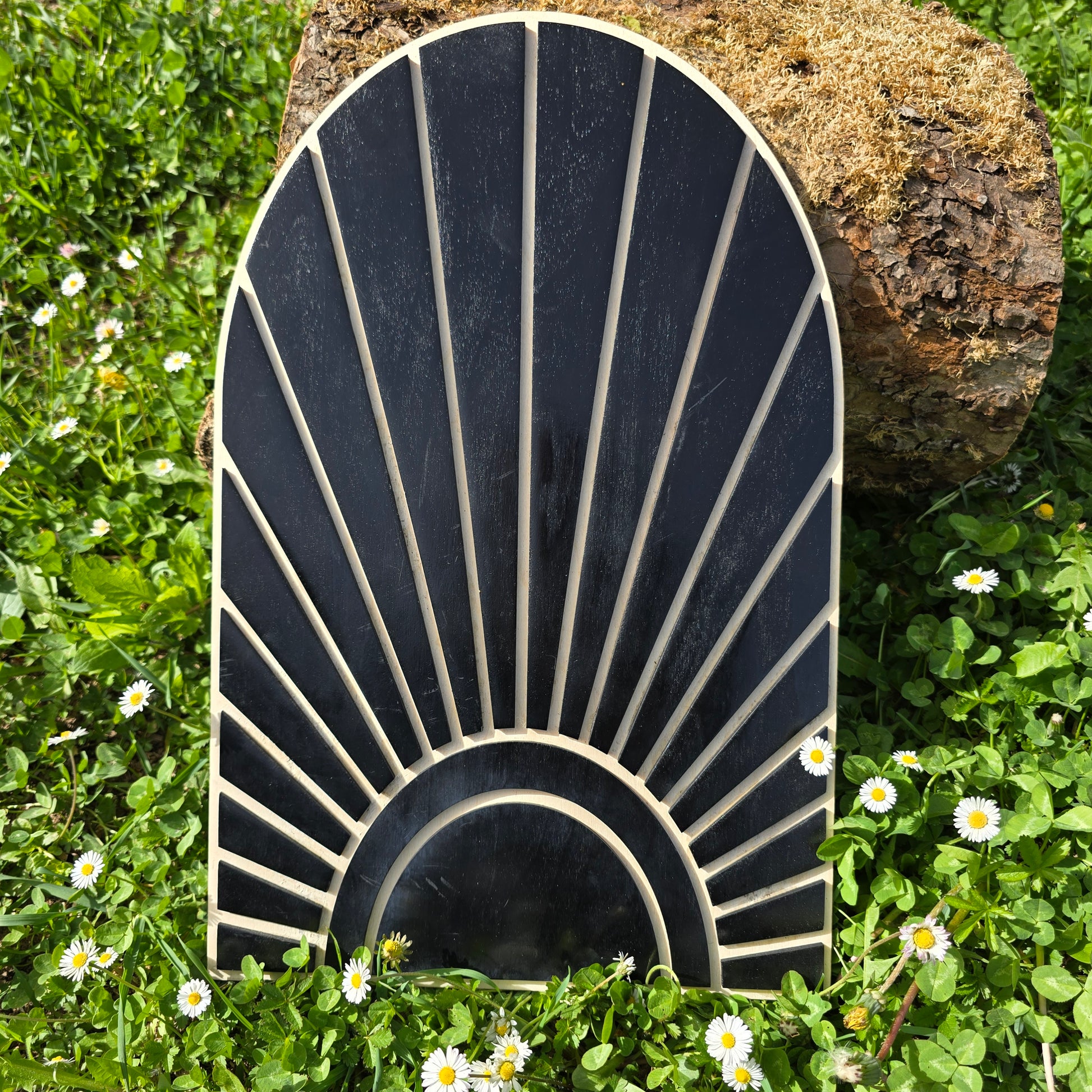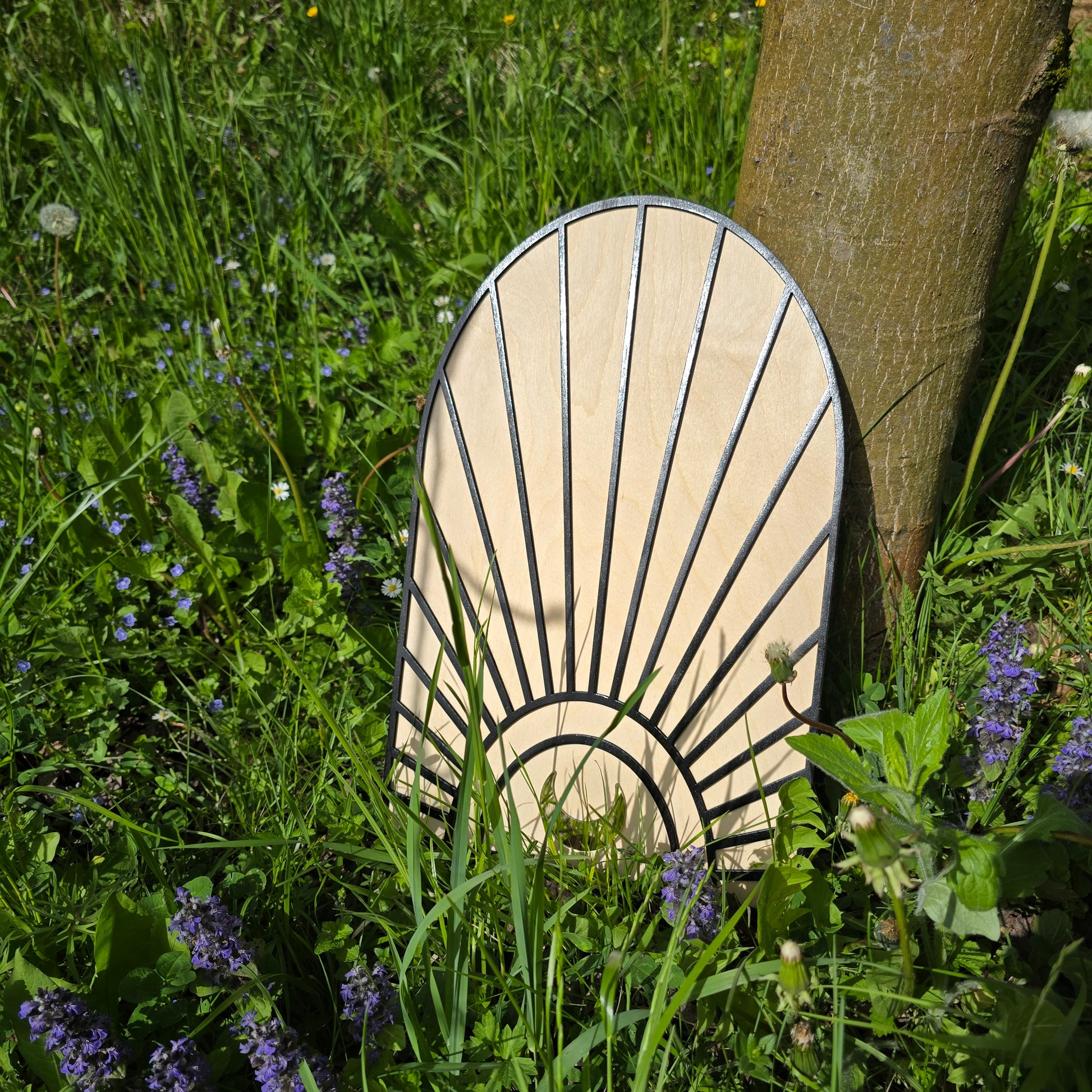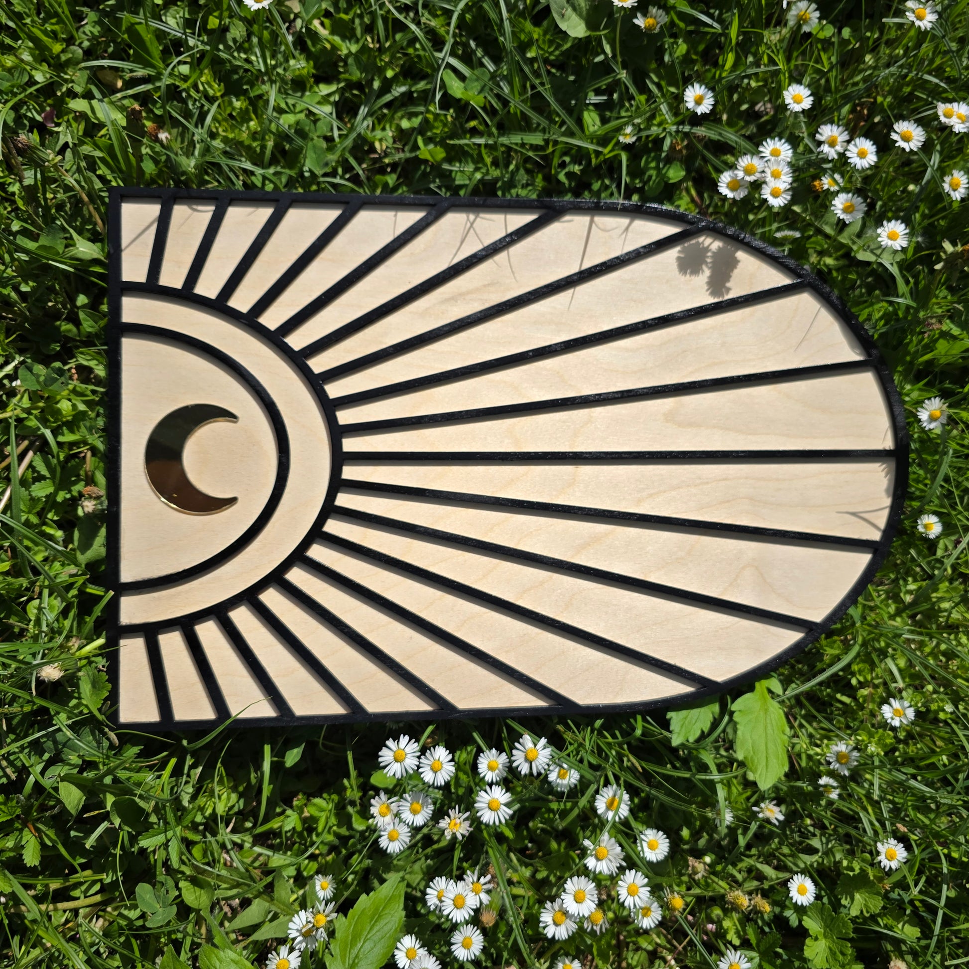 Vpadljiv kos stenske dekoracije, ki združuje simboliko naravnih ciklov in sodoben dizajn. Minimalistična zasnova s kontrastom naravnega lesa in črne barve ter zlatim luninim srpom ustvarja močan estetski vtis – hkrati nežno in močno, toplo in grafično.