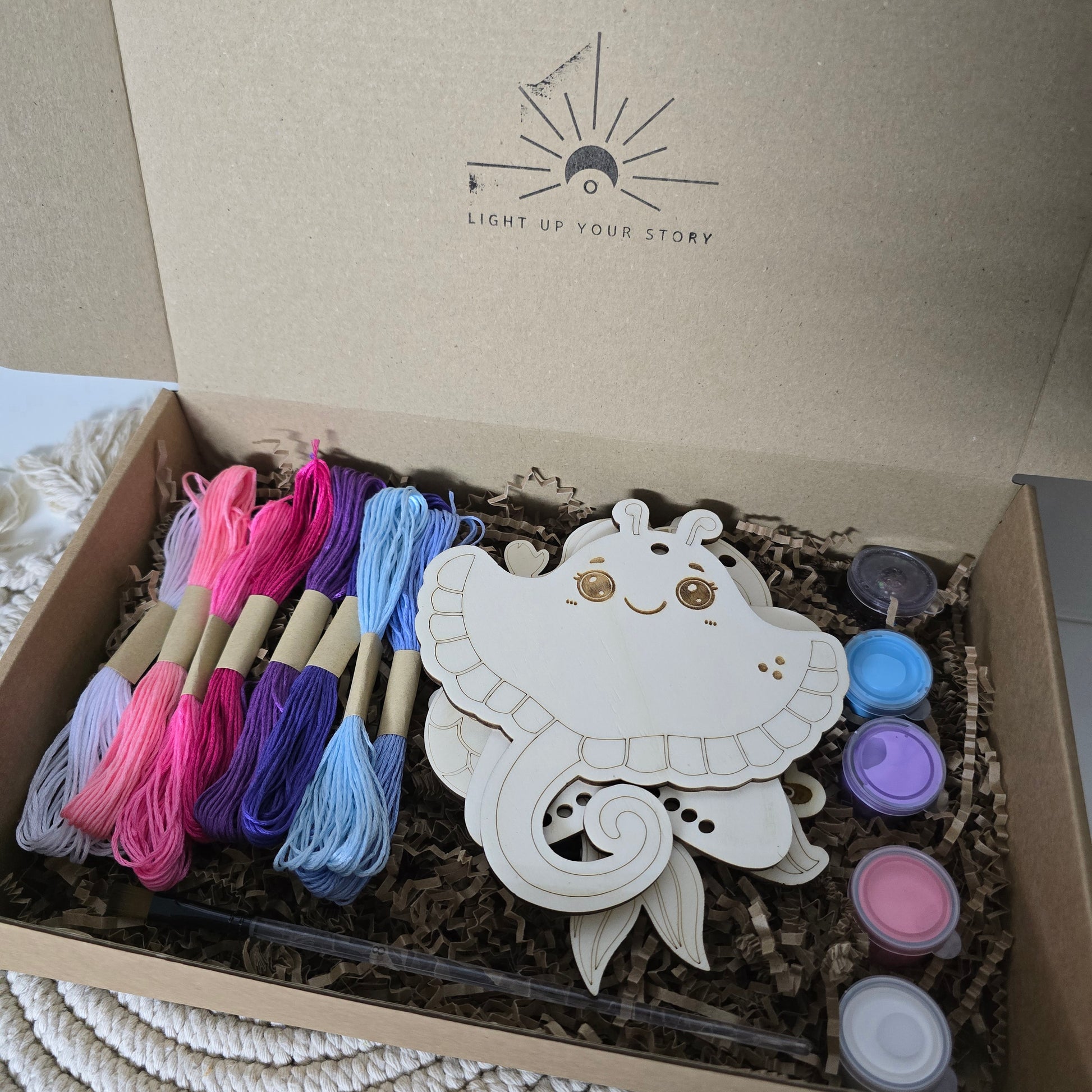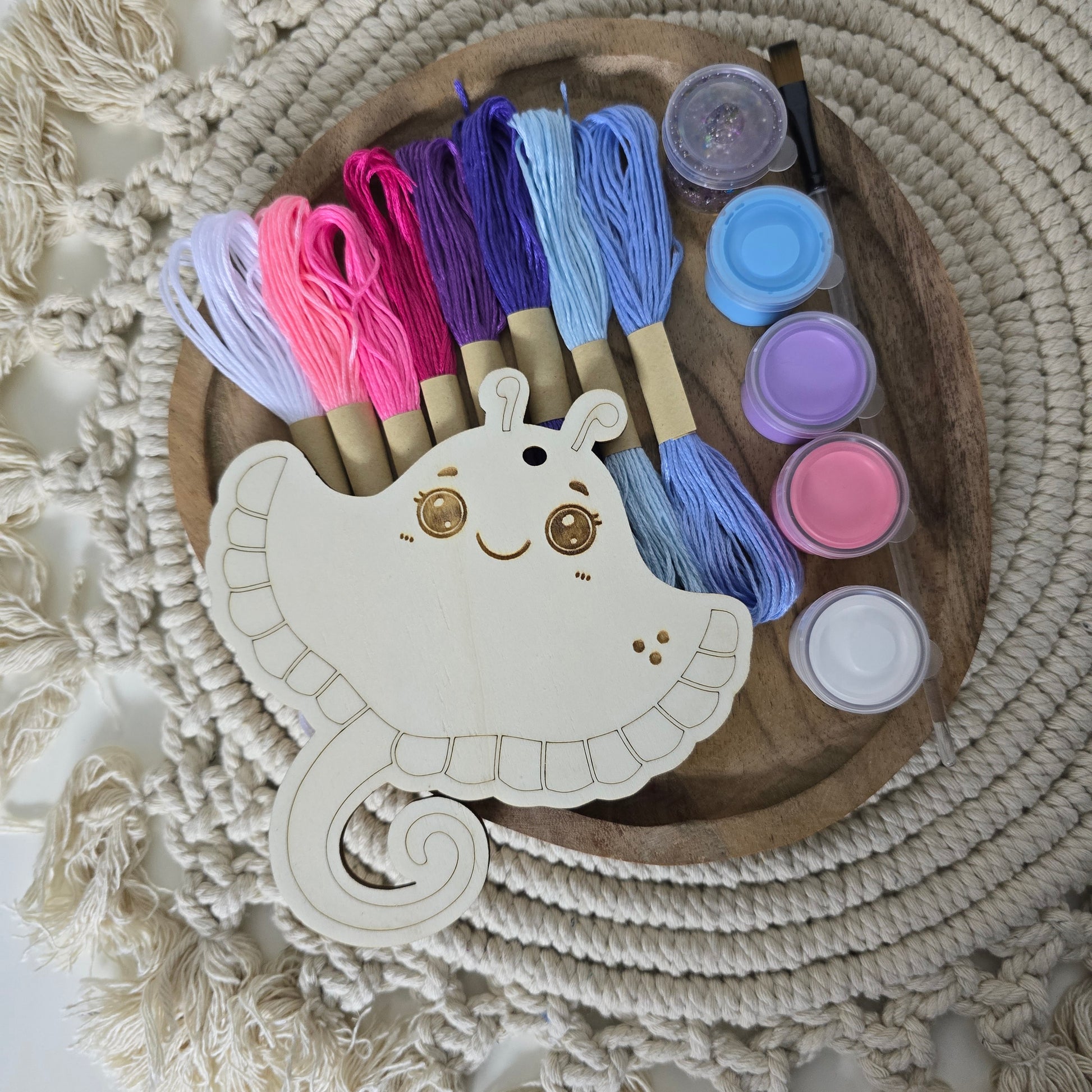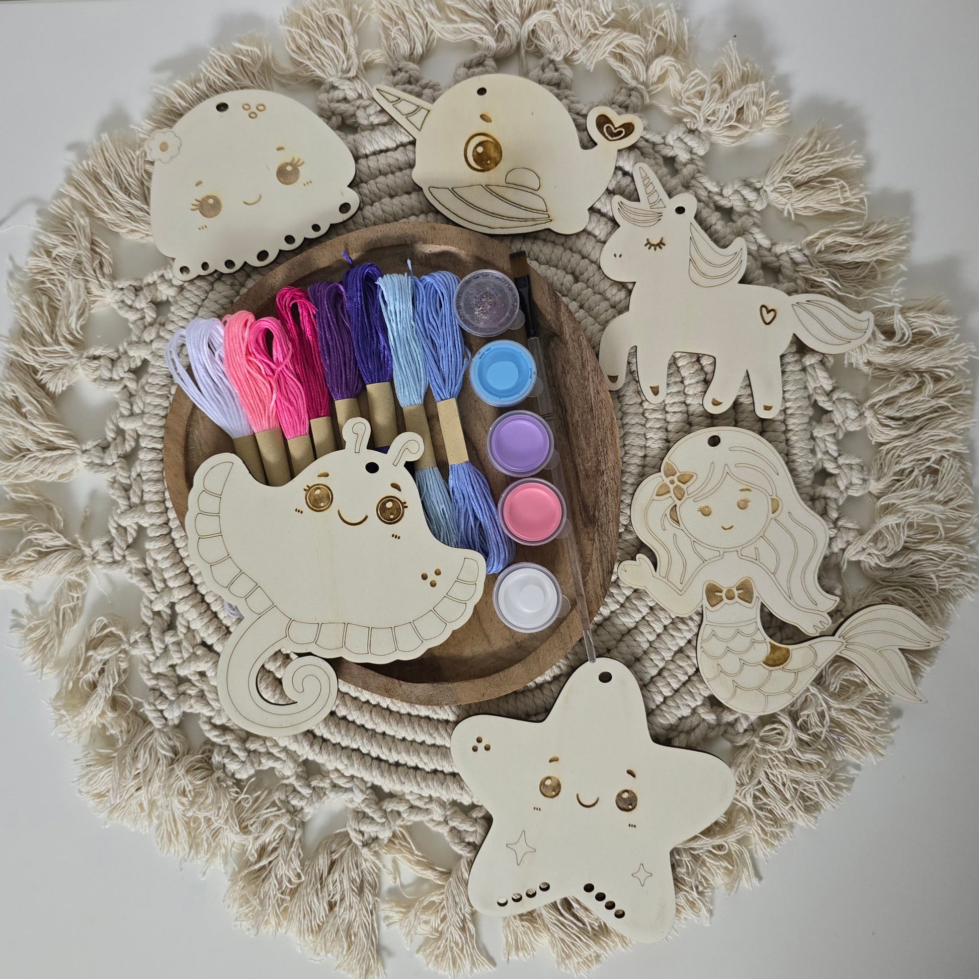 V paketu prejmete vse, kar potrebujete za okraševanje šestih prikupnih lesenih figuric – morske deklice, morskega samoroga (narvala), raže, morske zvezde, meduze in samoroga.