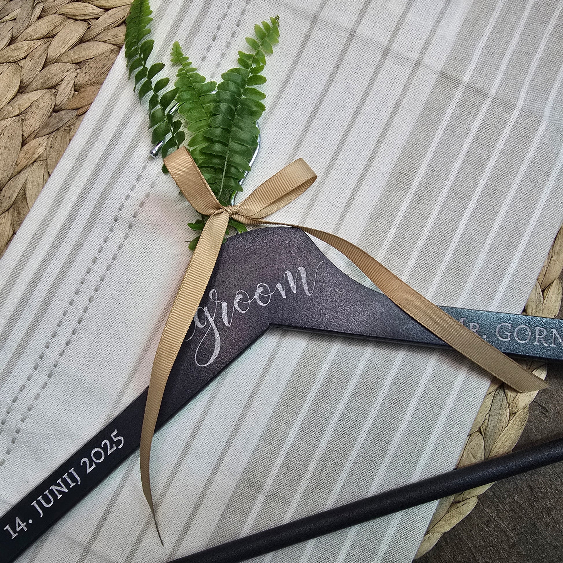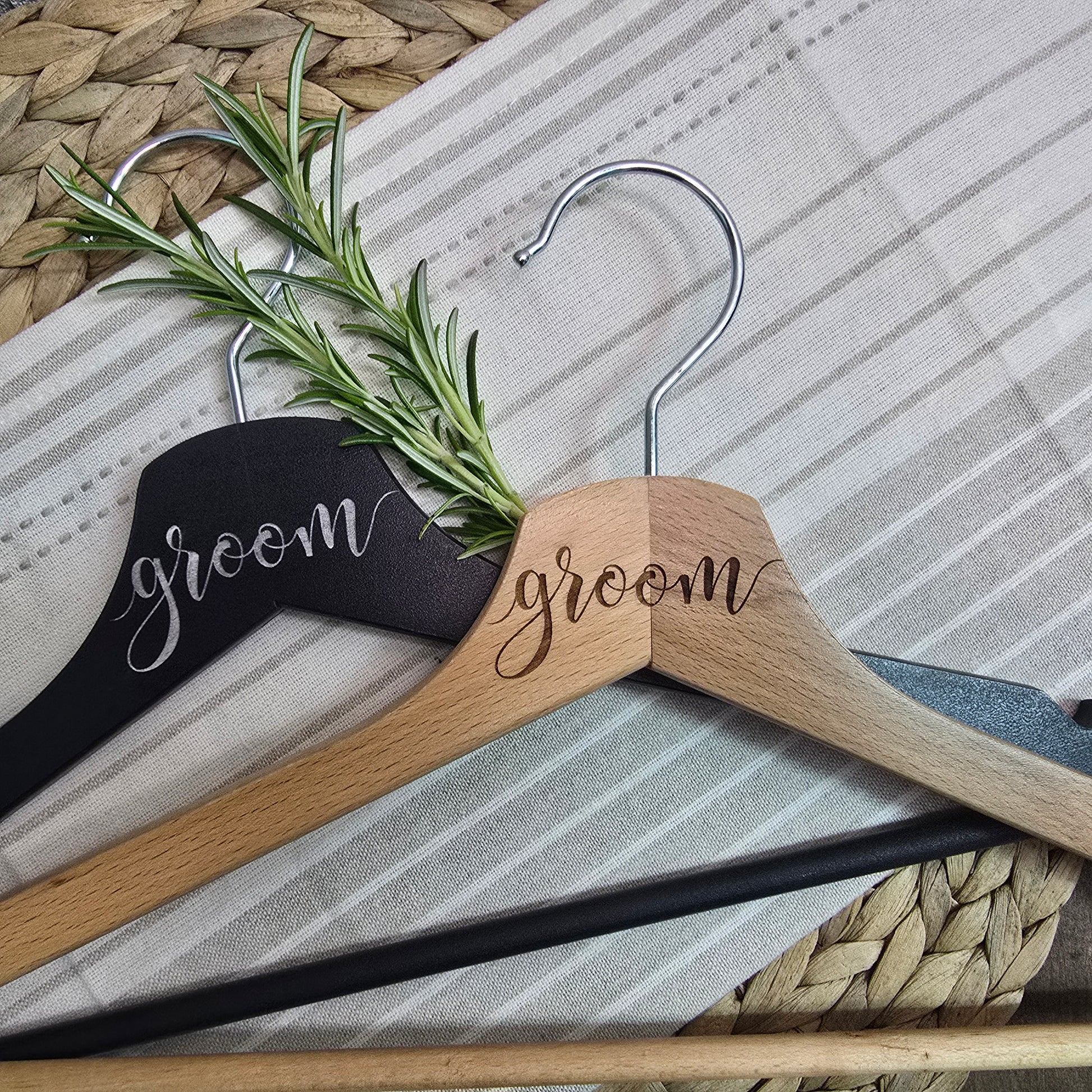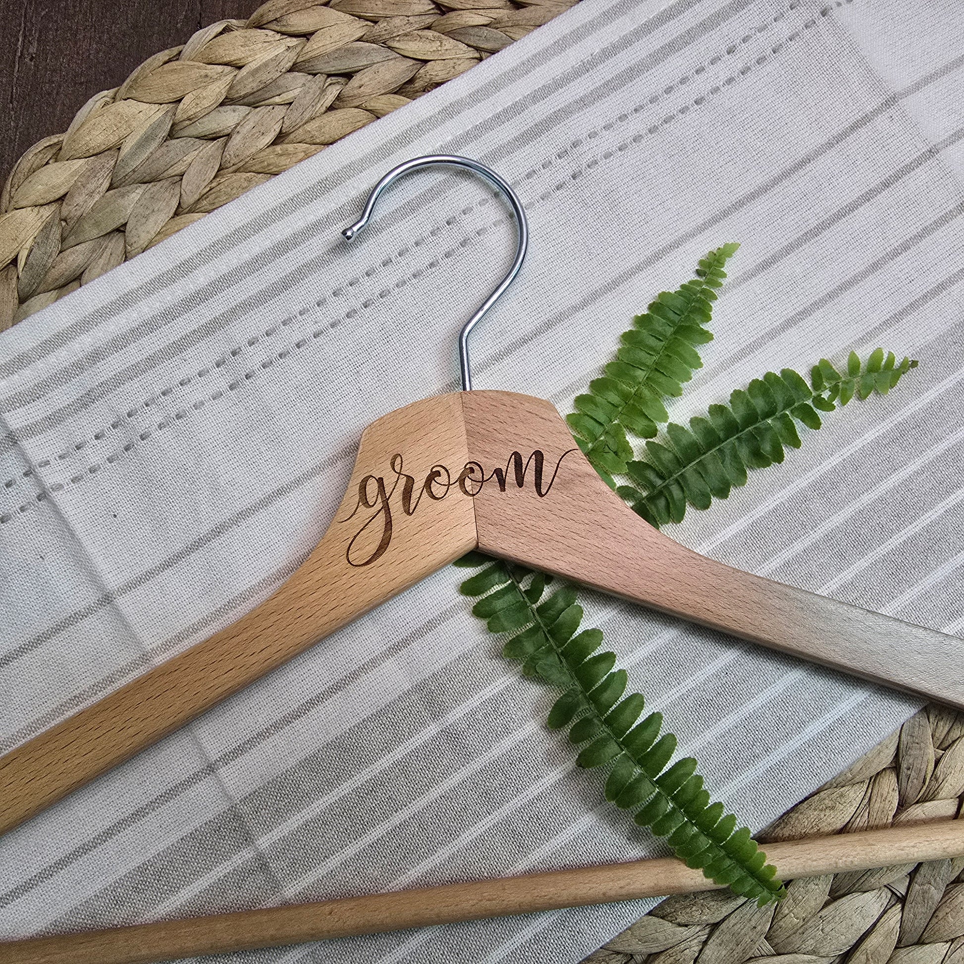 Lesen obešalnik z gravuro "groom", popoln detajl za ženinovo poročno obleko.