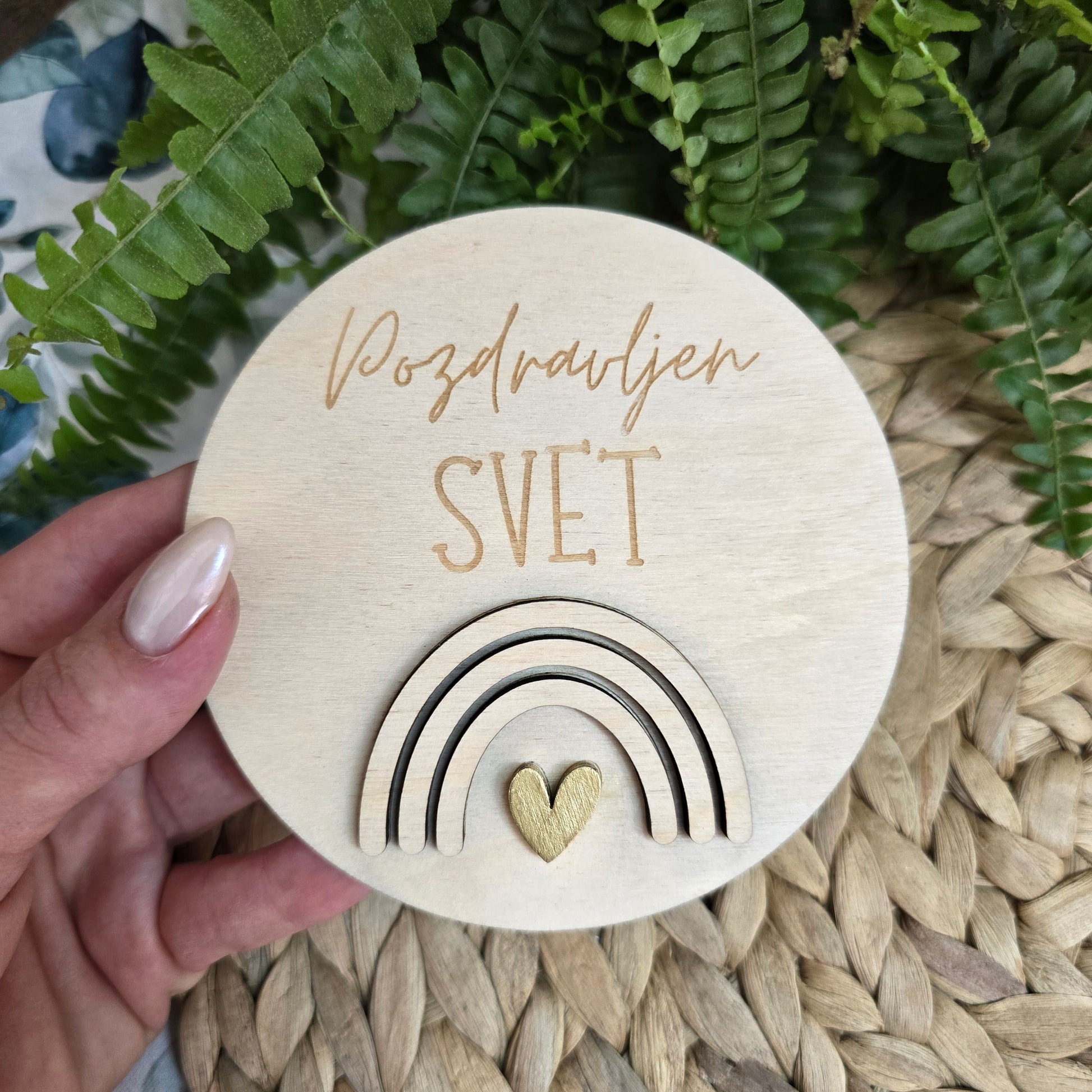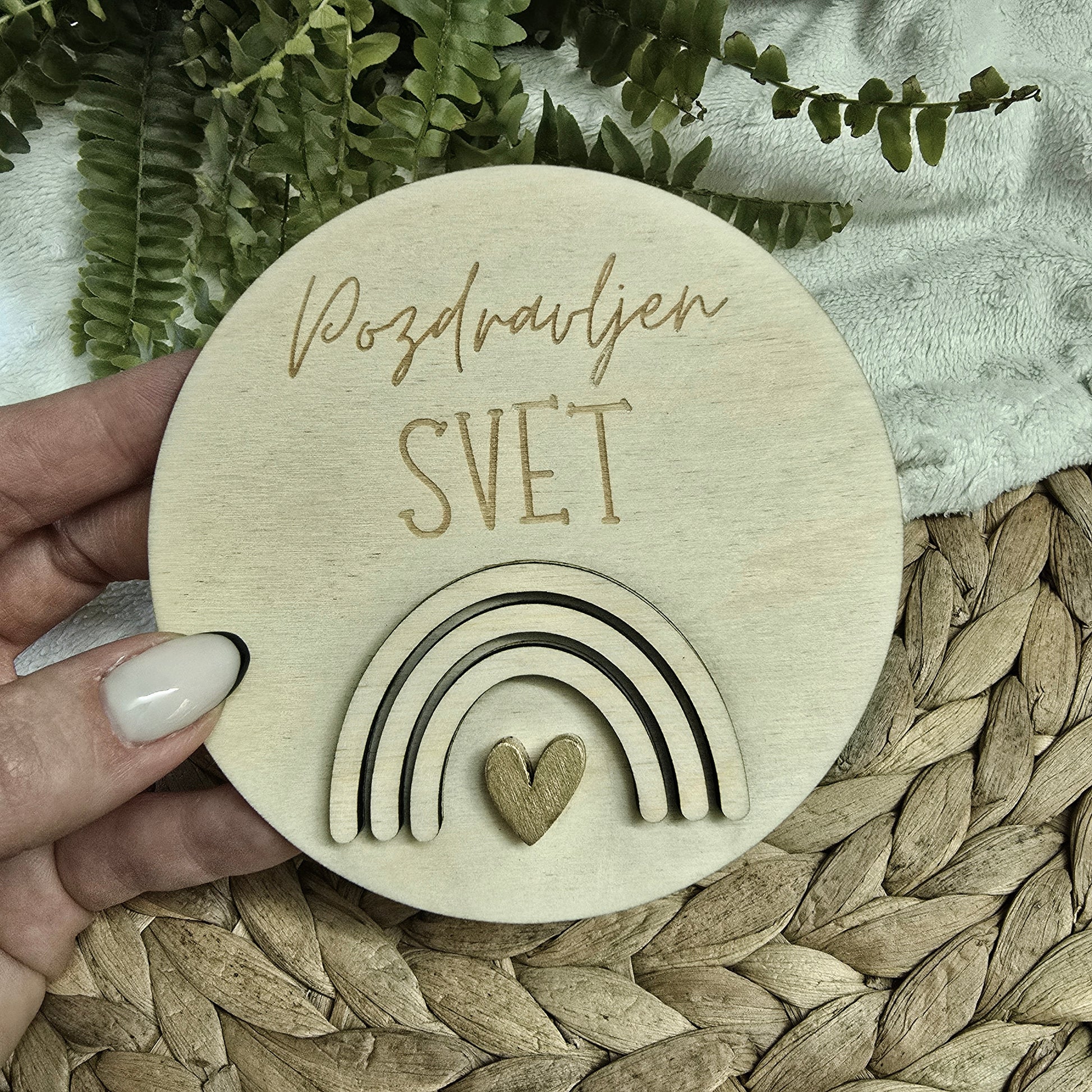 Čudovita okrogla ploščica z napisom Pozdravljen, svet in izrezano mavrico z zlatim srčkom je popoln rekvizit za prvo fotografijo novorojenčka. Izdelana iz naravnega lesa z lasersko gravuro in detajli, ki izražajo toplino, nežnost in dobrodošlico novemu življenju.