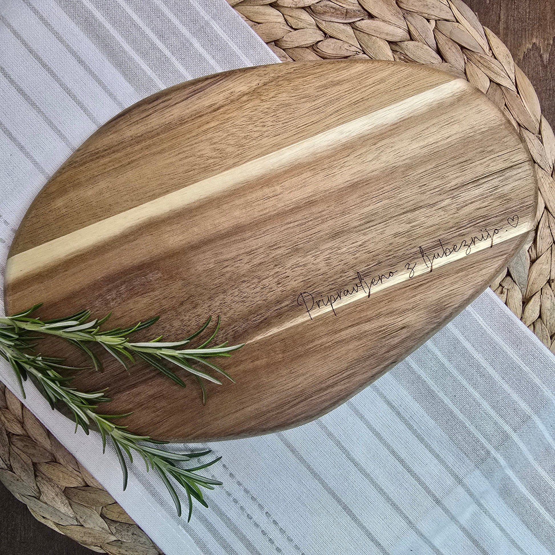 Izdelana iz masivnega akacijevega lesa, z ročno graviranim napisom "Pripravljeno z ljubeznijo", ki ji doda čustveno noto. Idealna za serviranje malic, drobnih prigrizkov ali kot poseben detajl v kuhinji.