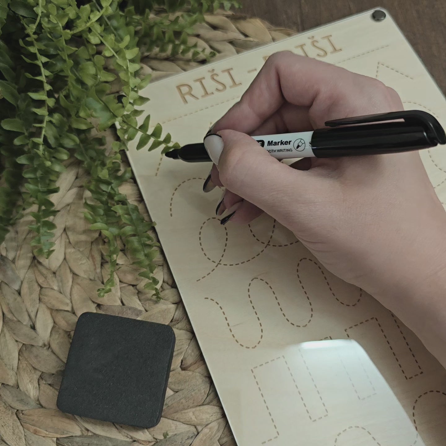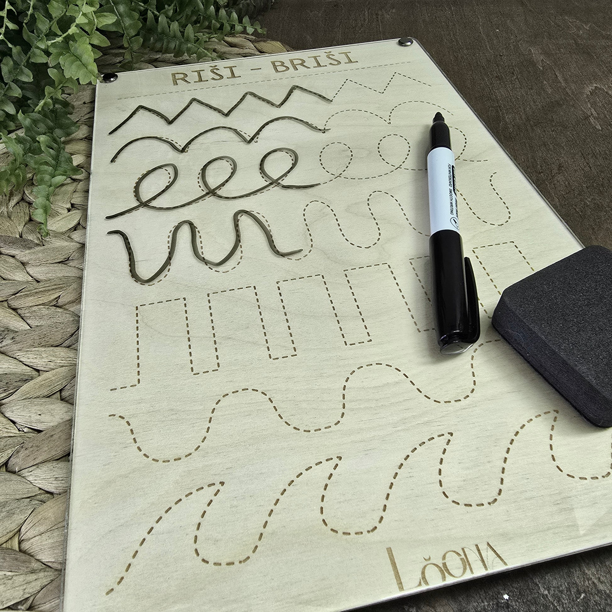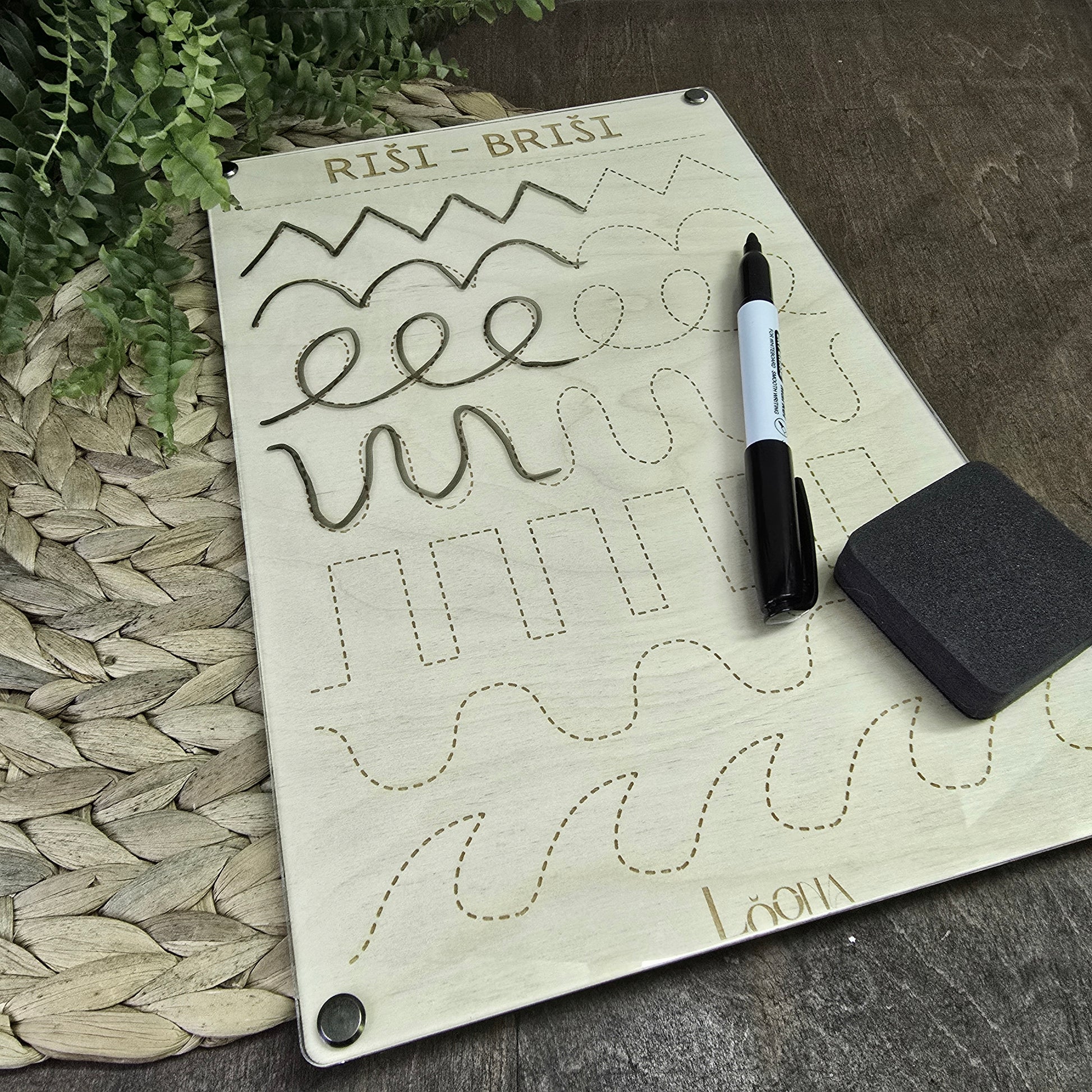 Didaktična tabla Riši – Briši je zasnovana z mislijo na predšolske otroke, ki razvijajo osnovne spretnosti pisanja in fine motorike. Spodnji del je izdelan iz kakovostnega brezovega lesa z lasersko graviranimi vzorci, zgornja plast pa iz prosojnega akrila, po katerem otrok piše s priloženim flomastrom in briše znova in znova (vključuje tablo, flomaster in gobico).