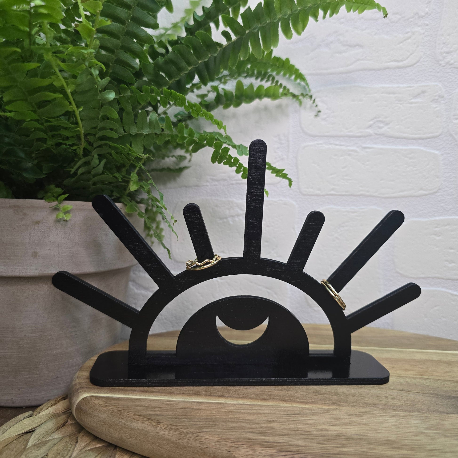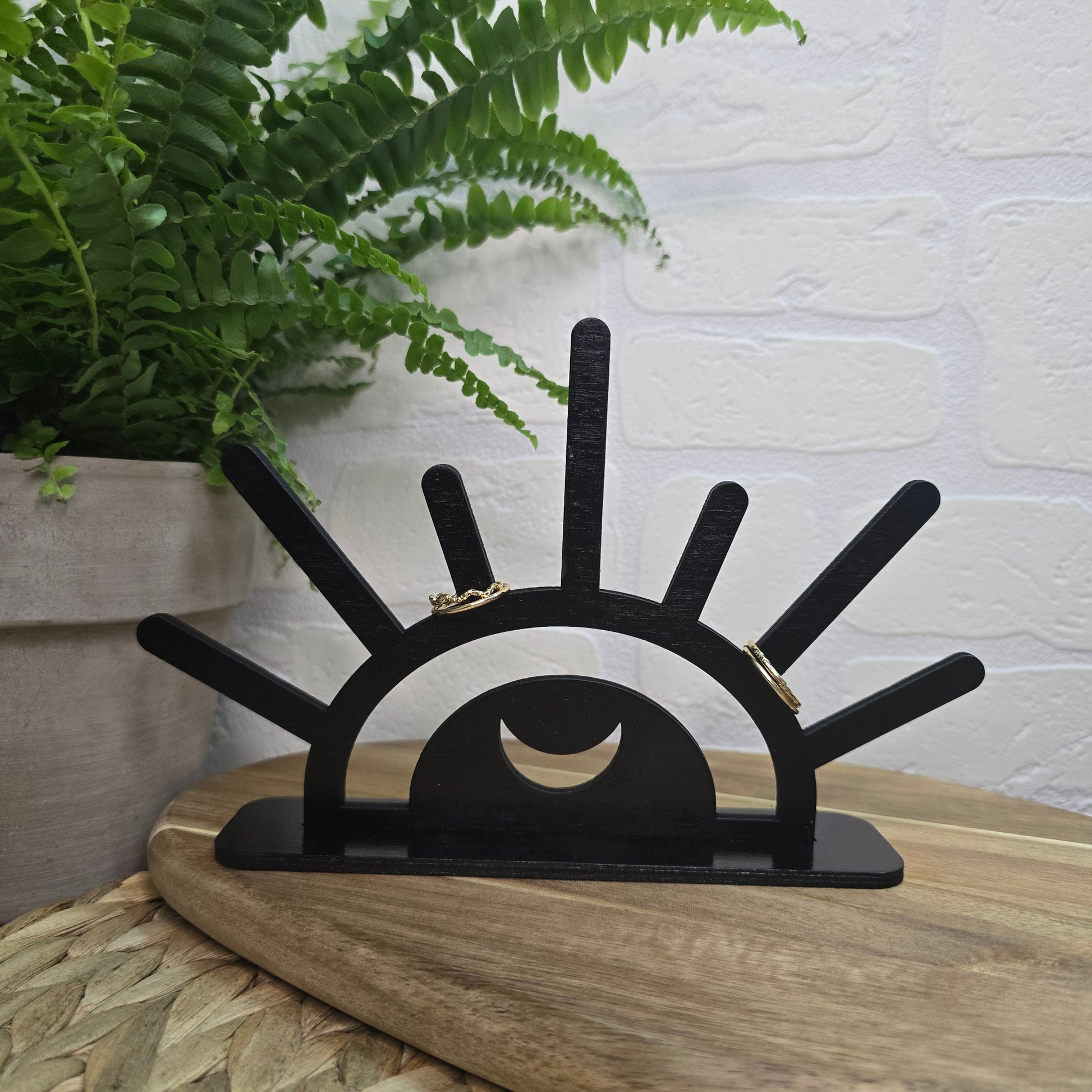 Stojalo v obliki sončnih žarkov z lunico v središču je izdelano iz črne, ročno obdelane breze. Njegova lahkotna, a izrazita oblika poskrbi, da nakit vedno najde svoje mesto – urejeno, estetsko in na dosegu roke.