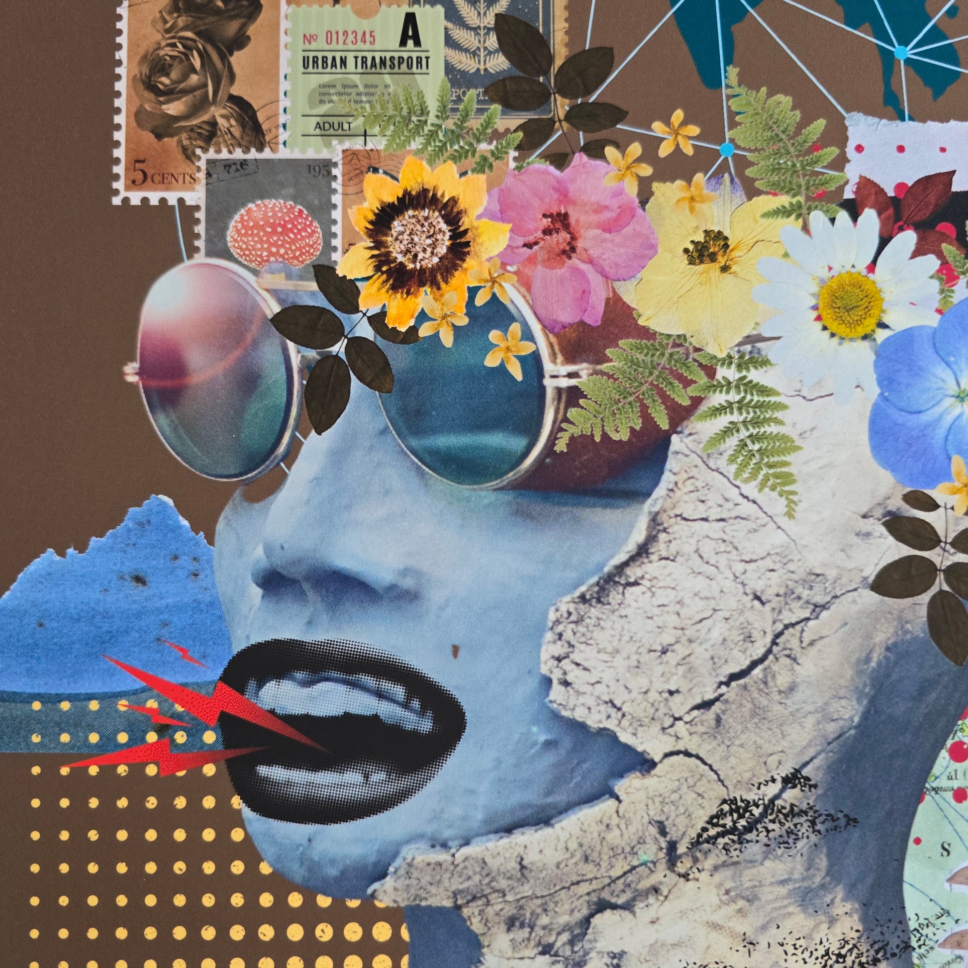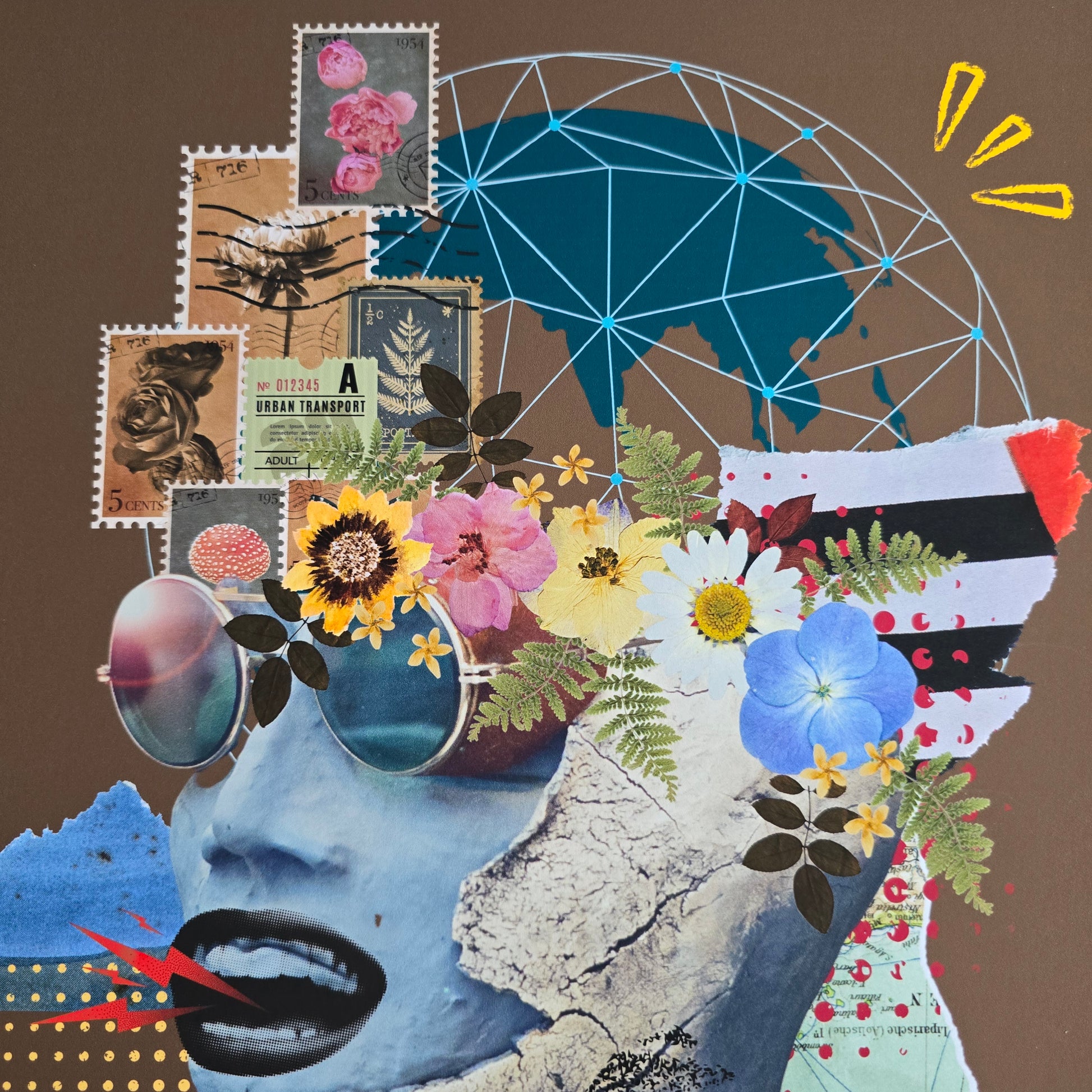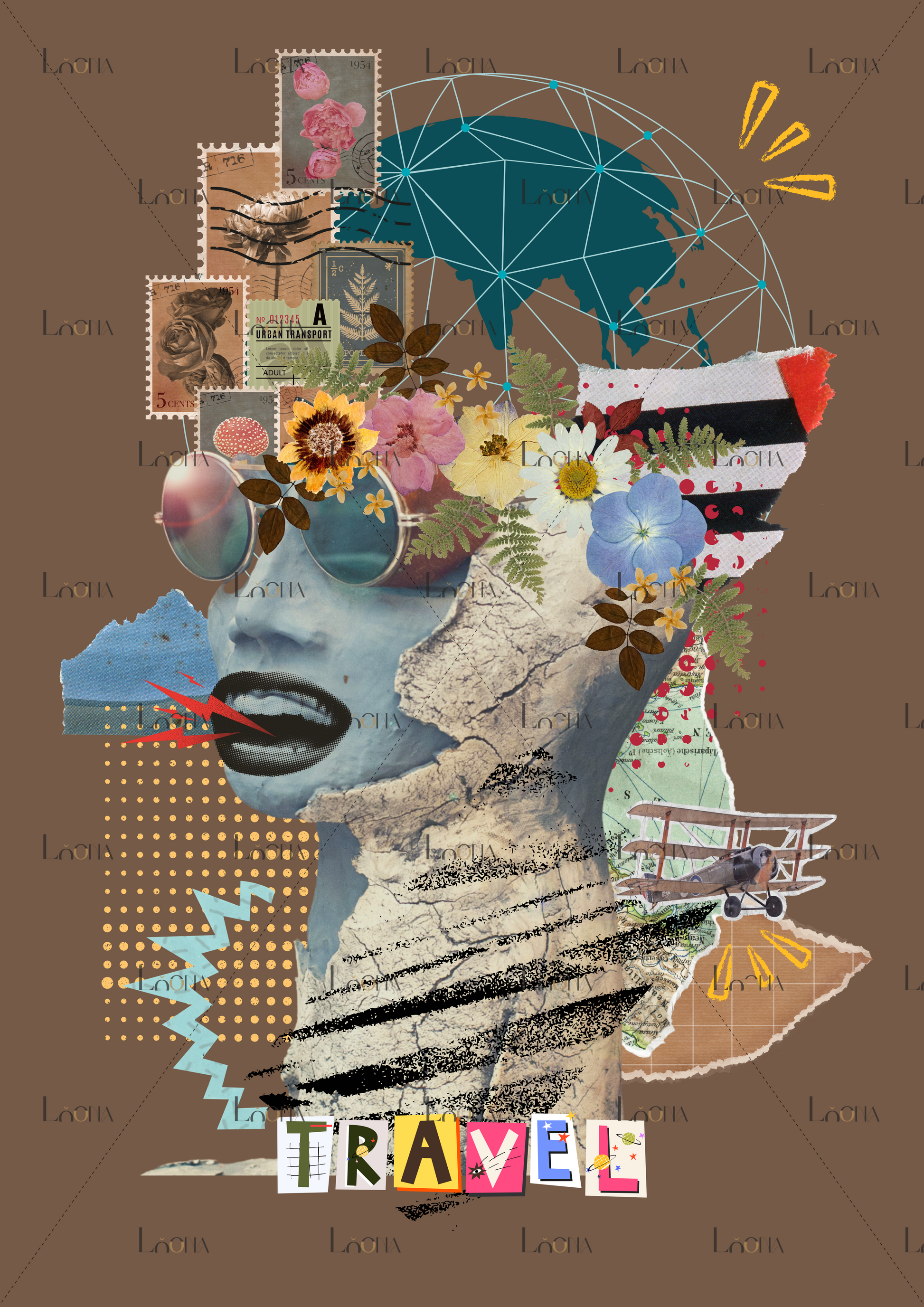 Kolaž TRAVEL prikazuje simbolično podobo raziskovalca duha in sveta: razpokana skulptura kot metafora preobrazbe, znamke kot spomini na poti, očala kot pogled v novo, cvetje kot notranja rast, zemljevid kot načrt in letalo kot pobeg.