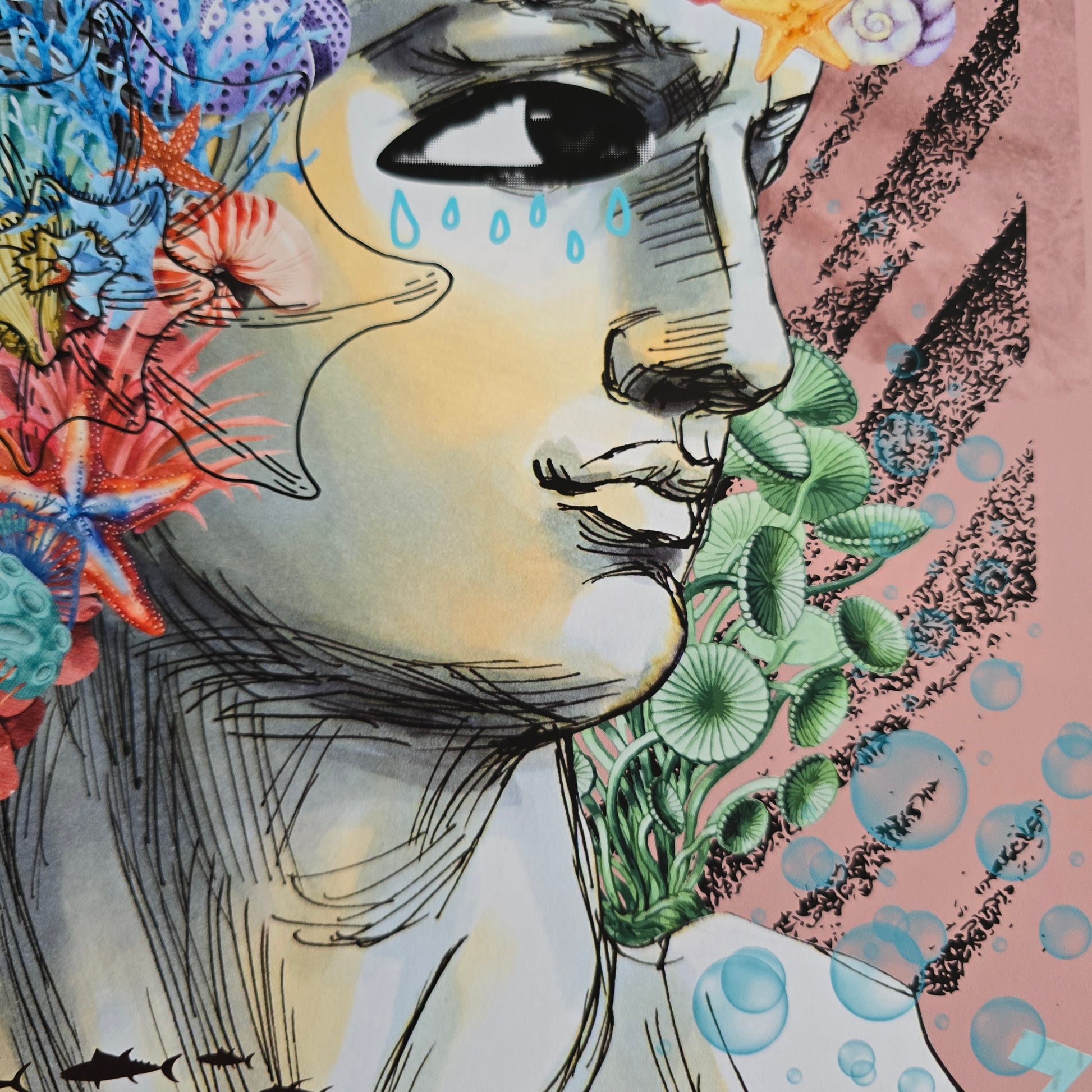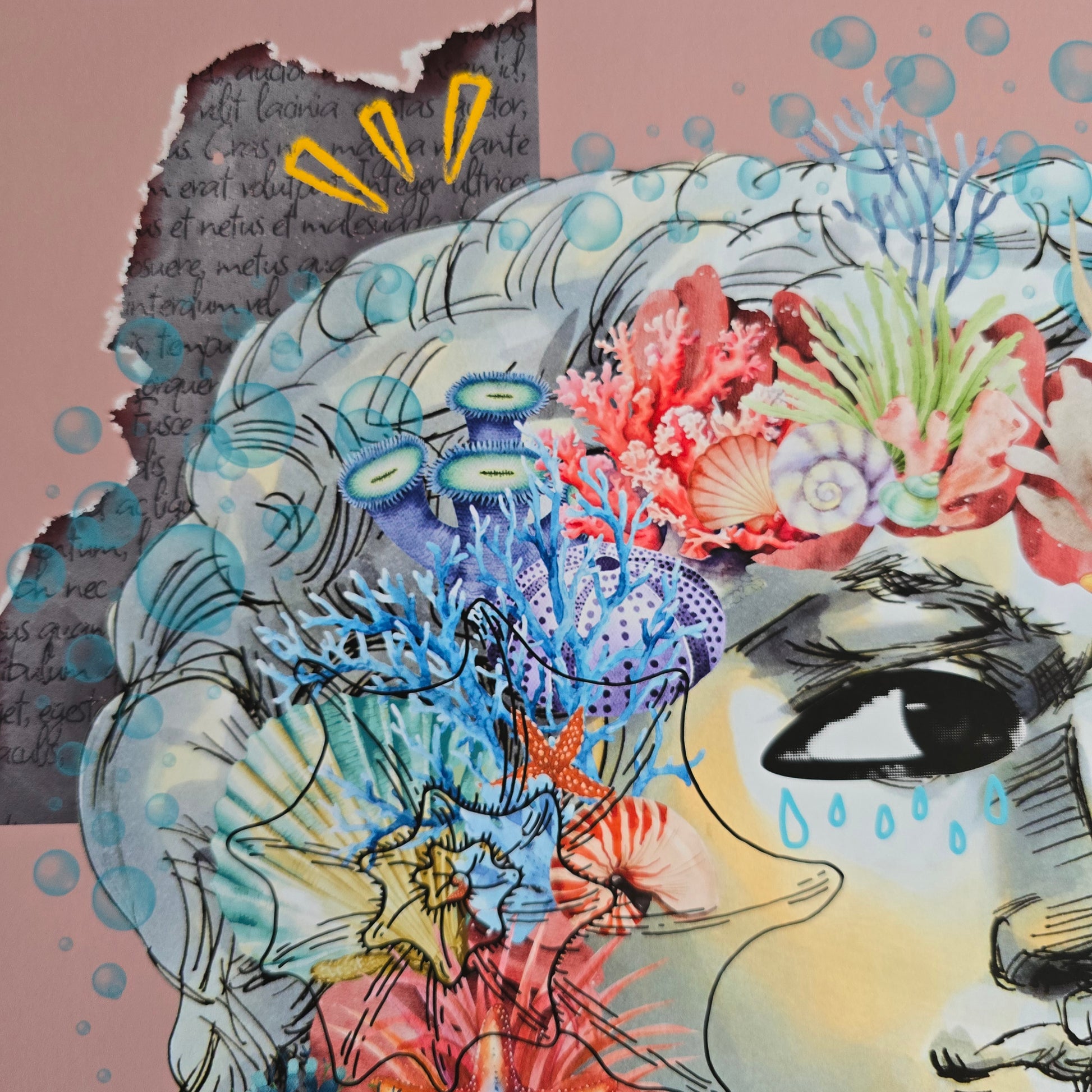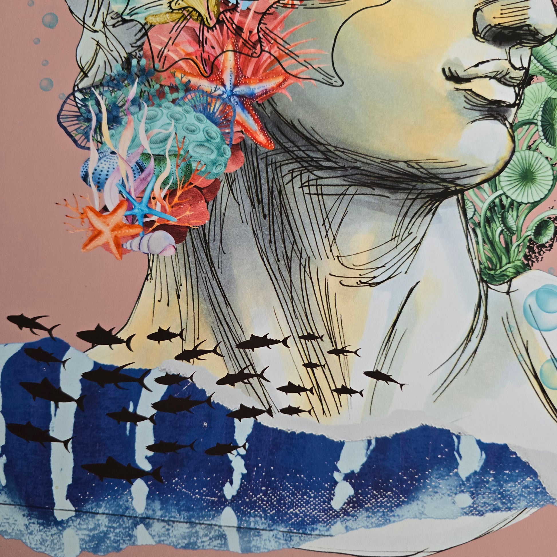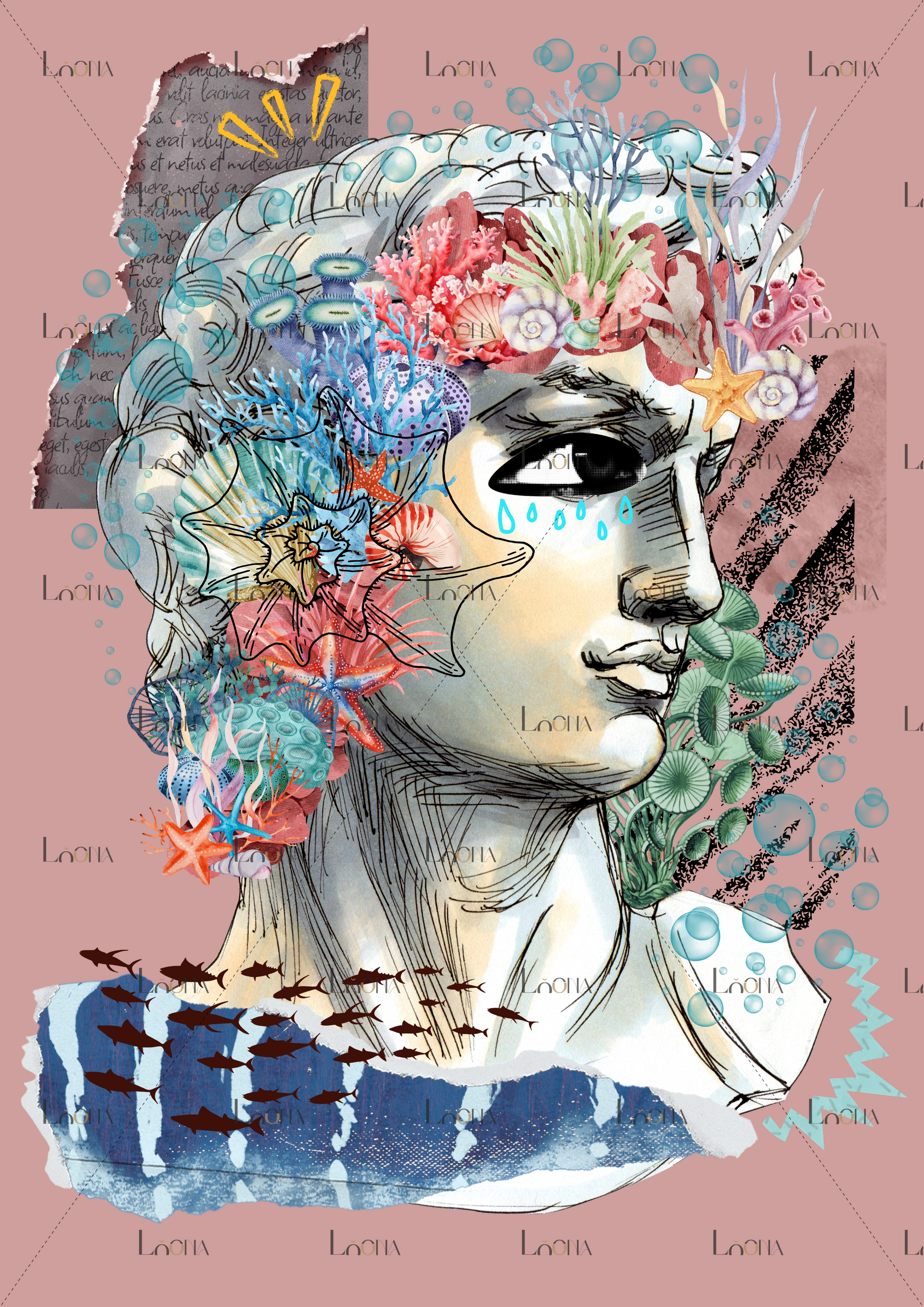 Kolaž Underwater Thoughts združuje klasičen kiparski profil z morskimi elementi, kot so korale, meduze, školjke in ribje jate. Glava ni več kamnita, temveč živa – prepletena z občutki, spomini, ranljivostjo. Solze niso znak bolečine, ampak očiščenja. So voda, ki vse povezuje.
